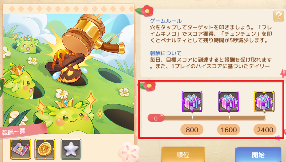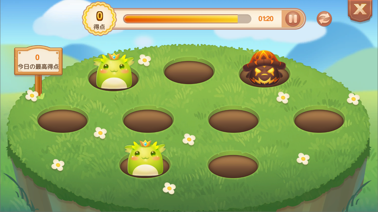 「フレイムキノコ」を叩くことでスコア獲得、「チュンチュン」を叩くとペナルティとして残り時間が5秒減少します。