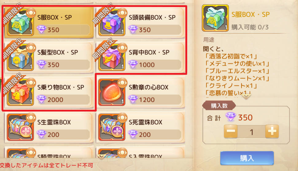 さらに、今回の「宝石商店」において、期間限定の「S服BOX・SP」「S頭装備BOX・SP」「S髪型BOX・SP」「S背中BOX・SP」「S乗り物BOX・SP」を購入できます!BOXを開封すると、過去すごろくにて獲得できる一部のアバターを入手可能です。