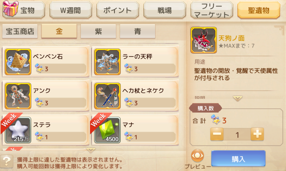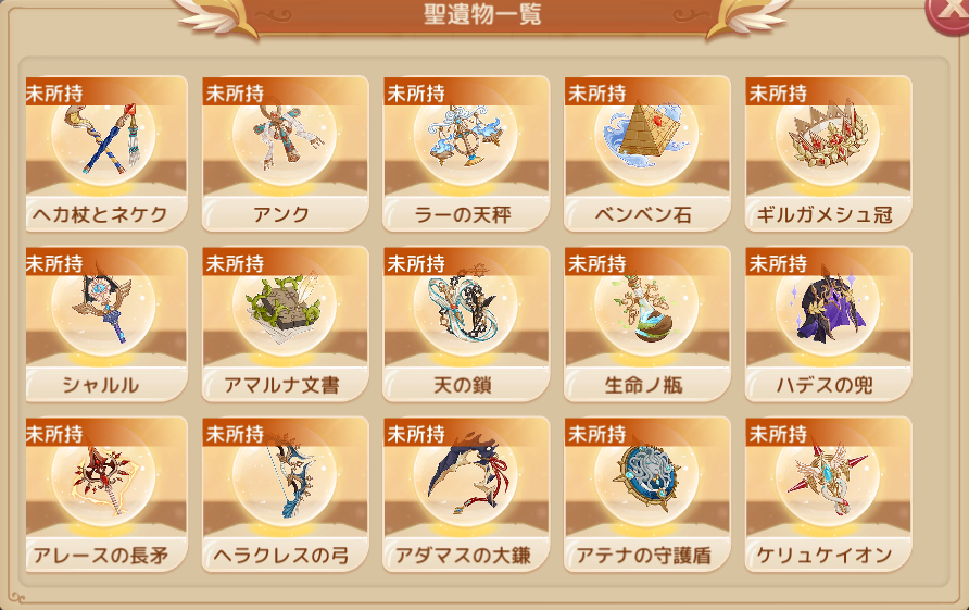 実際のラインナップおよび登場の有無は、各サーバーの開設日数に基づいて個別に設定されます。ご希望の聖遺物が登場しているか、更新日にてゲーム内にてご確認ください。