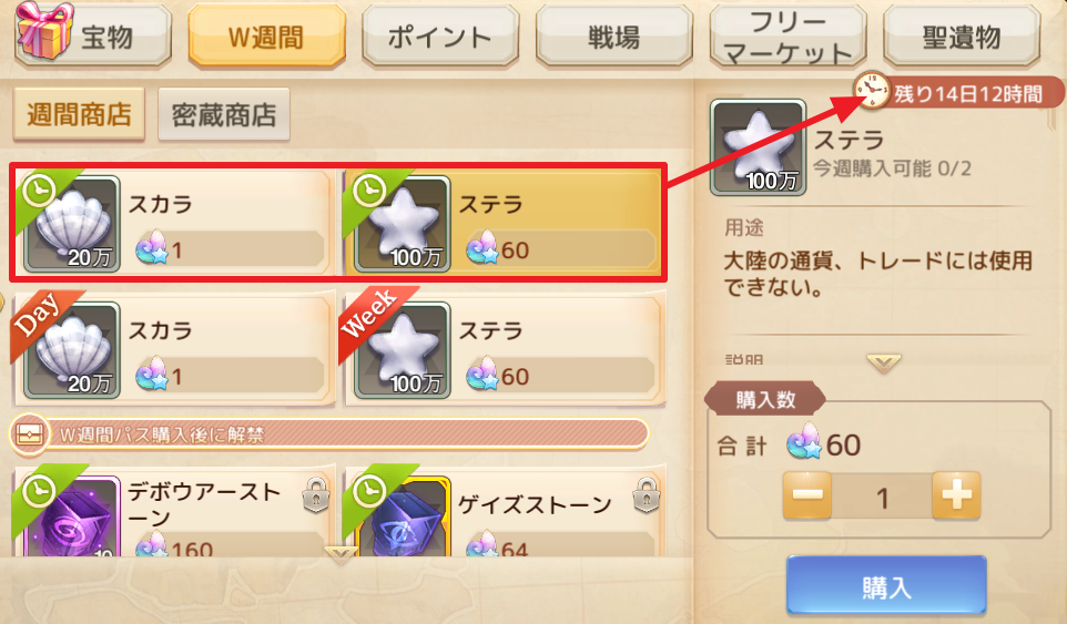 すごろくを周回すると「神秘商店」に入店できるようになります。 開店している間はお得なアイテムを「有償シェル」や 「スカラ」で購入できます。