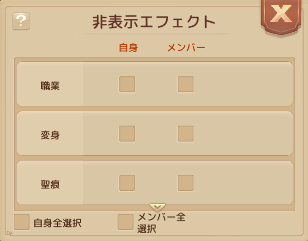 「エフェクト非表示」では、エフェクトを非表示にしたい項目タイプを選択すると、戦闘中、選択した項目タイプのエフェクトが表示されなくなります。