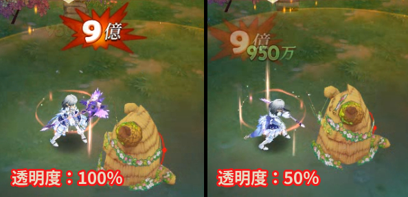 「戦闘設定」では、戦闘に関する文字(ダメージ量など)の透明度を調整できます。
