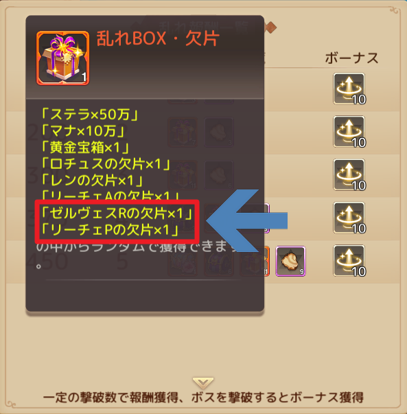 今回のアップデートにて、サーバーレベル135以上のキャラクターに対し、累計撃破報酬の「乱れBOX・欠片」に「リーチェPの欠片」が追加されます。