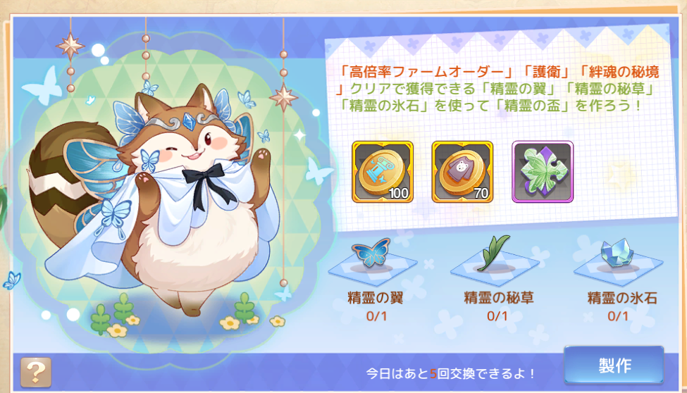 3種類の材料を集めて精霊の盃を製作しましょう!材料は「高倍率ファームオーダー」「絆魂の秘境」「護衛」から獲得できます。