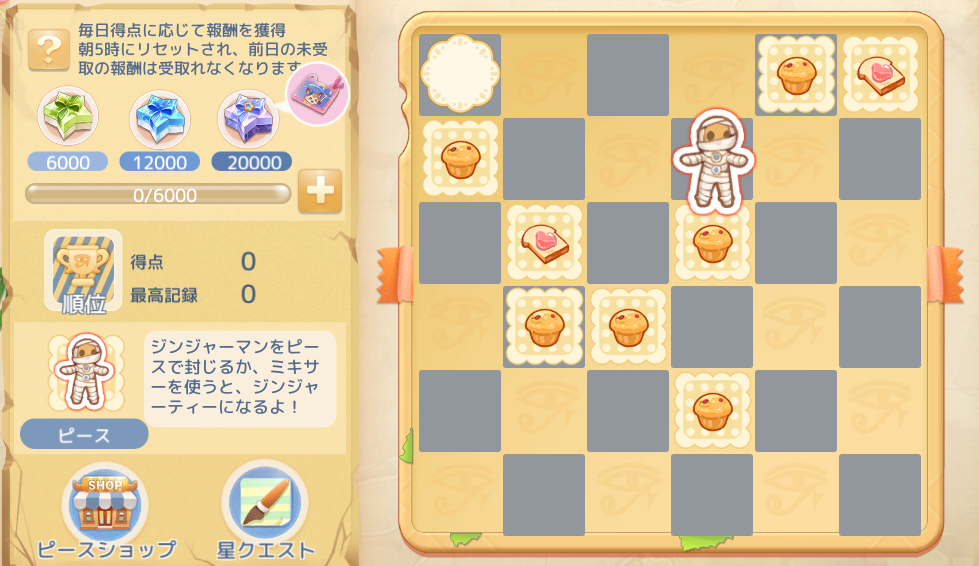 周年イベント第三弾!ミニゲーム「パティシエ」が登場!同じピースを3つ並べるとピースが進化し、得点が加算されます。たくさんピースを進化させて高得点を目指しましょう!