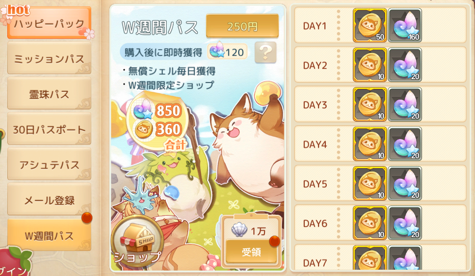 11月12日(水)より、お得セットにて「W週間パス」が登場いたします!W週間パスを購入後、すぐに「無償シェル×120」が獲得できるほか、毎日「無償シェル」と「W週間金貨」を入手できます!14日間で最大「無償シェル×850」と「W週間金貨×360」が獲得できます!