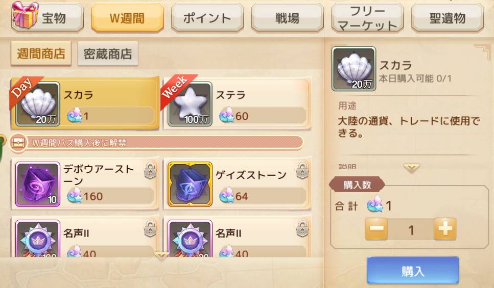 W週間パスを購入後、購入可能なアイテムが解禁。