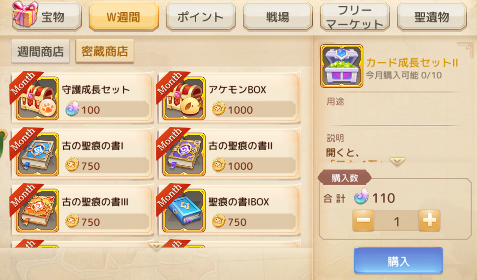 密蔵商店では、有償シェルやW週間金貨を使用して、各種アイテムと交換できます。また、カード・音霊・機甲などの強化や洗練に必要な素材を含む成長セットも販売しています。