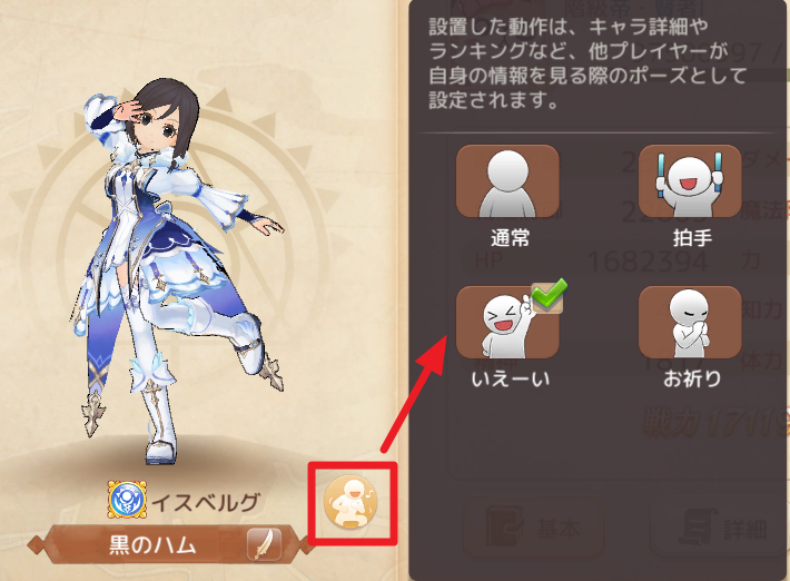 キャラクターの属性ページにおいて、キャラクターの「動作」を選択して設置できるようになりました。設置した動作は、キャラ詳細やランキングなど、他プレイヤーが自身の情報を見る際のポーズとして設定されます。