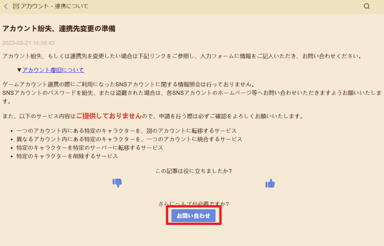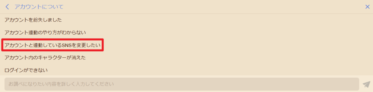 1.お問い合わせ項目から「アカウントについて」→「アカウントと連動しているSNSを変更したい」を選択します。