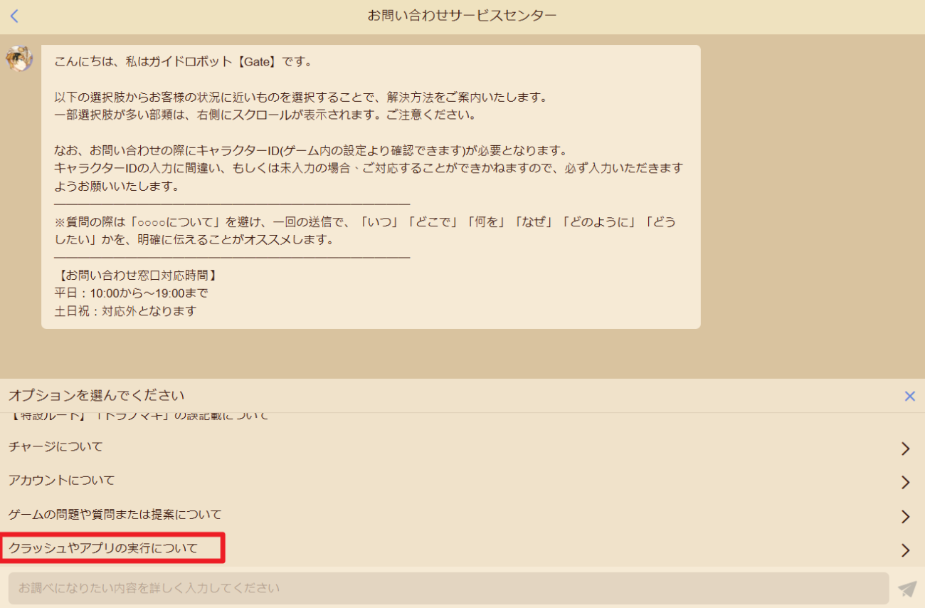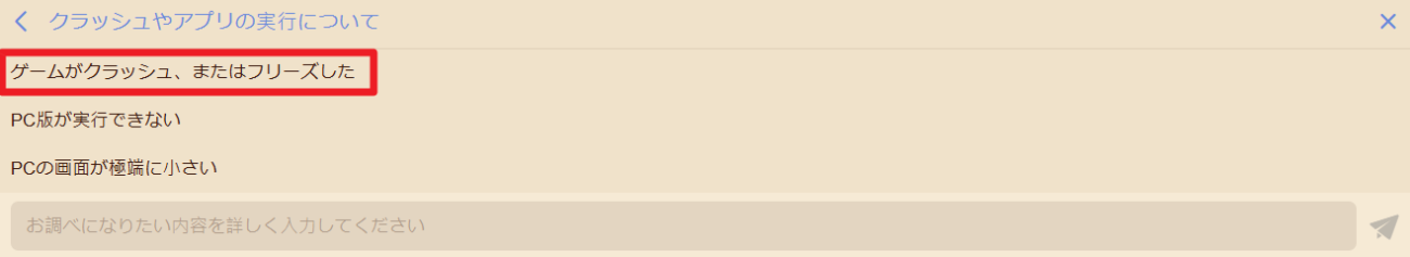 1.お問い合わせ項目から「クラッシュやアプリの実行について」→「ゲームがクラッシュ、またはフリーズした」を選択します。