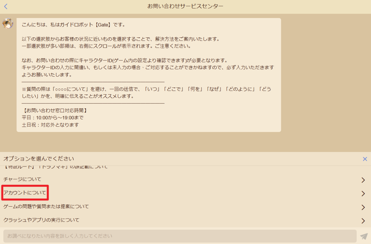 2.AIによる自動応答に従い、必要な情報(キャラクターIDなど)を入力するフォームへ進みます。