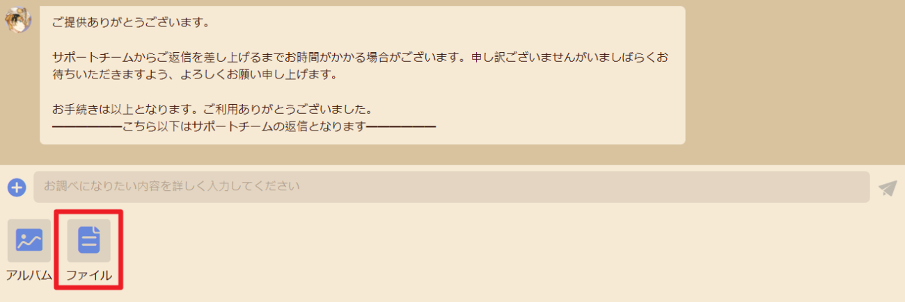 その際は、まず端末内にある任意の画像(スクリーンショット等)を一度送信してください。ガイドロボットから画像内の返信があった後、改めてログファイルを添付できるようになります。