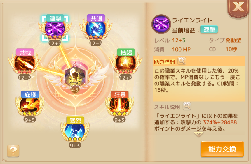 「能力分配」にて能力を交換することができます。異なるコンテンツに応じて、能力を異なるスキルに設置することはできます。