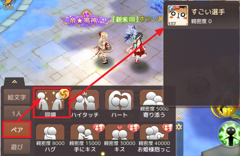 ペアの「同調」をタップし、プレイヤーを選ぶと、ペア同調が開始されます。